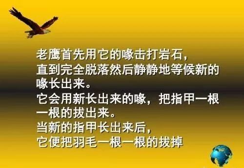 许老师首先让我们观看《鹰之重生》短片,老鹰最长的寿命有70年,但是当它活到40岁的时候,它的爪子会开始老化,无法有力的捕捉食物,喙会变得又长又弯,翅膀会长出羽毛,变得厚重难以飞翔。此时鹰只有两种选择,要么等死;要么拔掉自己的羽毛,磨掉自己的爪子和喙,经历漫长而又痛苦的蜕变后,才能重生,再活30年。